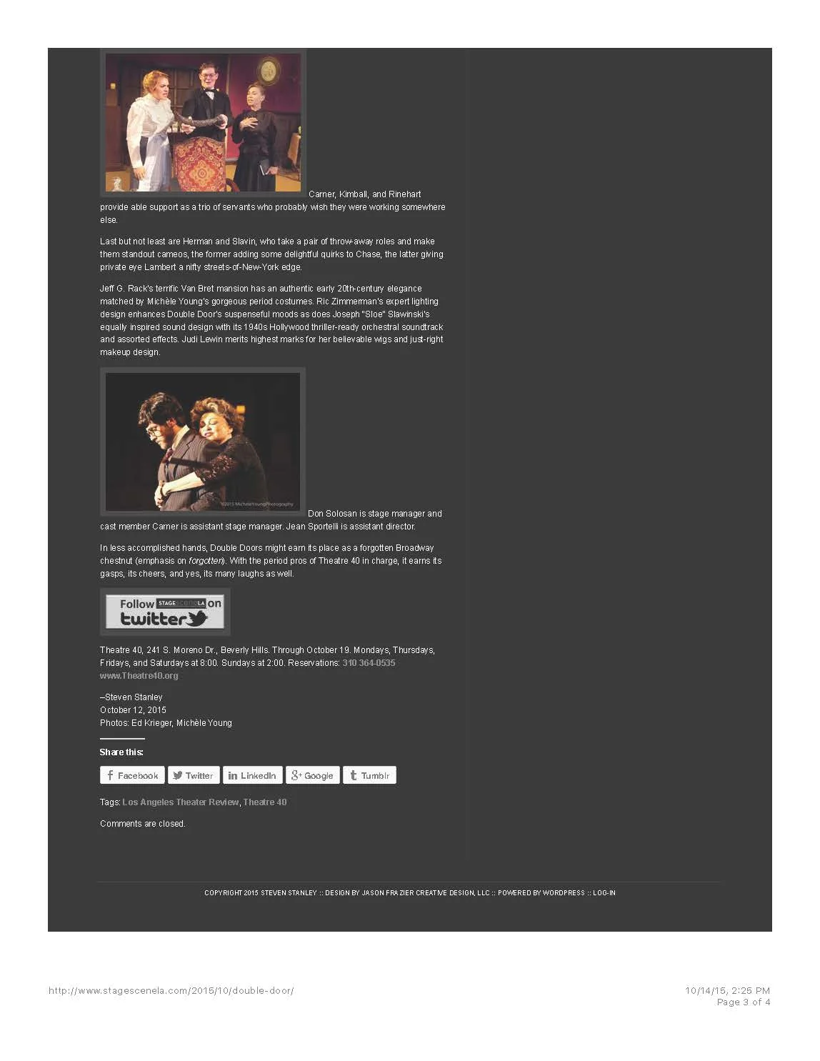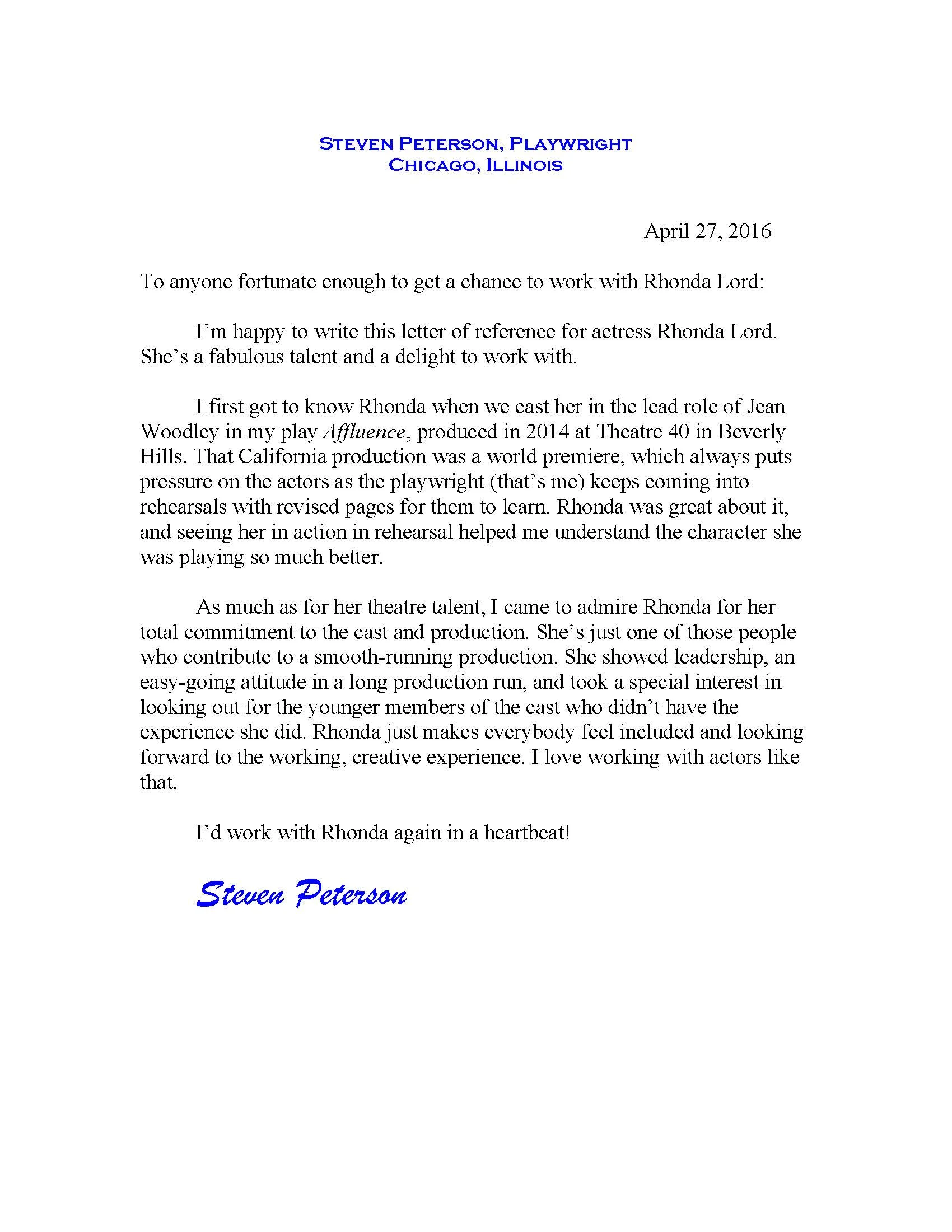 "Rhonda Lord has been a member of Theatre 40 for more than 25 years. She serves on the Artistic Committee, and wears many hats within the troupe. Lord gives an explosive portrayal of the money-loving, power-hungry, drug-addicted Jean. Her performance, alone, is worth a trip to the Reuben Cordova Theatre at Beverly Hills." - Life in LA